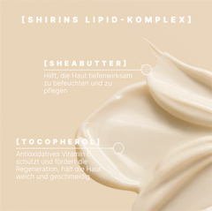 Der Lipid-Komplex sorgt für eine tiefgehende Pflege und stärkt die natürliche Hautbarriere. Der reichhaltige Komplex aus Sheabutter und Tocopherol (Vitamin E) nährt die Haut intensiv, spendet wertvolle Lipide und schützt sie vor äußeren Einflüssen.