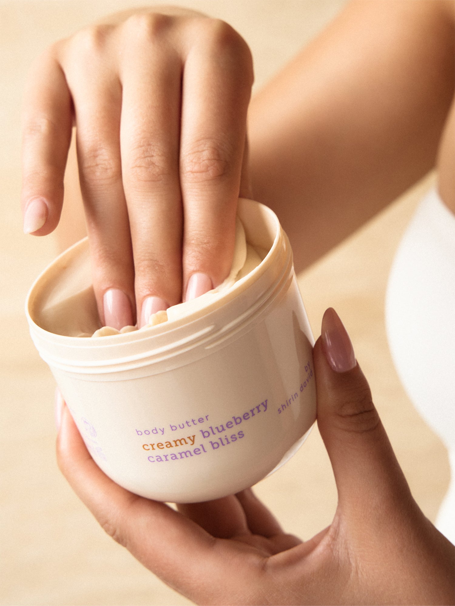 Nimm dir die gewünschte Menge der Shirin Beauty Body Butter. Trage sie auf deine trockene oder noch leicht feuchte Haut auf – und genieße, wie sich der süß-fruchtige Duft von Blueberry Caramel entfaltet.